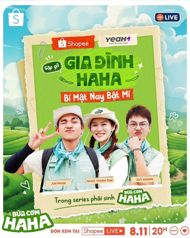 Từ ngày 1.11, series phái sinh “Bữa Cơm Haha” chính thức lên sóng với tổng cộng 30 tập, phát hành vào 20H mỗi ngày trên Shopee Video. Khán giả sẽ có cơ hội gặp lại Gia Đình Haha và thưởng thức những bữa cơm đầy ắp tiếng cười trong chương trình.